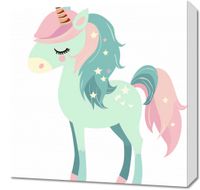 Obraz z serii wnętrza zatytułowany Jednorożec Marzeń. Na tej zachwycającej ilustracji przedstawiono pastelowego jednorożca, którego turkusowe ciało pokryte jest subtelnymi gwiazdkami, a jego miękka, różowa grzywa delikatnie opada. Zamknięte oczy i łagodny uśmiech dodają uroku tej mitycznej istocie, wprowadzając element spokoju i radości. Obraz idealnie nadaje się do pokoju dziecięcego lub innej przestrzeni przeznaczonej dla dzieci, tworząc atmosferę bajkowej krainy pełnej czarów i cudów. Delikatne kolory i uroczy wzór są doskonałe, aby rozbudzić wyobraźnię i dodać uroku każdemu wnętrzu, zachęcając do marzeń i optymizmu.