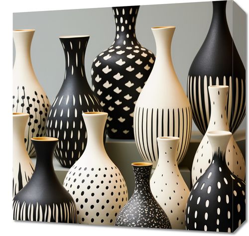 Obraz z serii wnętrza zatytułowany Kontrast i Harmonia. Eleganckie wazony w subtelnych odcieniach bieli i intensywnej czerni stoją dumnie na szarości tła. Geometryczne i abstrakcyjne wzory, które zdobią te wazony, przypominają tętniącą życiem tańczącą symfonię. Kropki, linie i formy tworzą intrygującą kompozycję, która przyciąga wzrok i dodaje wnętrzom wyjątkowej głębi. Subtelna gra świateł i cieni, a także kontrast między monochromatycznymi barwami, dodaje tej kolekcji odrobinę tajemniczości. Będzie to idealne dopełnienie zarówno dla nowoczesnych przestrzeni loftowych, jak i eleganckich salonów z naciskiem na design. Ten wyjątkowy plakat doskonale odnajdzie się w galeriach sztuki oraz w luksusowych hotelach.