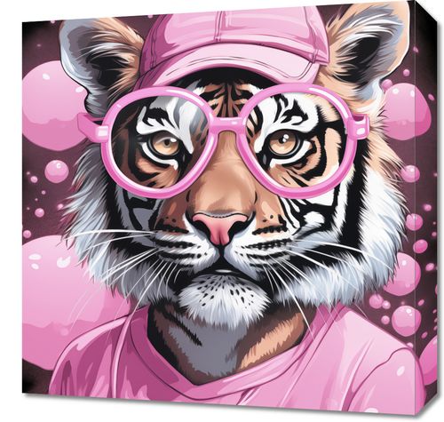 Obraz z serii pop art Ludzki Tygrys. Na obrazie widzimy głowę tygrysa, który jest ubrany w stylizowany, ludzki sposób. Tygrys ma na sobie różową czapkę z daszkiem oraz okulary w tym samym kolorze, co dodaje mu ludzkiego charakteru. Tło obrazu jest proste, pokryte bąbelkami w różnych odcieniach różu, co tworzy zabawny i lekko surrealistyczny klimat. Ten kolorowy i kreatywny projekt może przyciągnąć uwagę w różnorodnych przestrzeniach, od młodzieżowych pokoi po galerie sztuki. Jest to doskonały przykład współczesnego połączenia natury i kultury pop, który może być tematem rozmów i oryginalnym elementem dekoracyjnym.