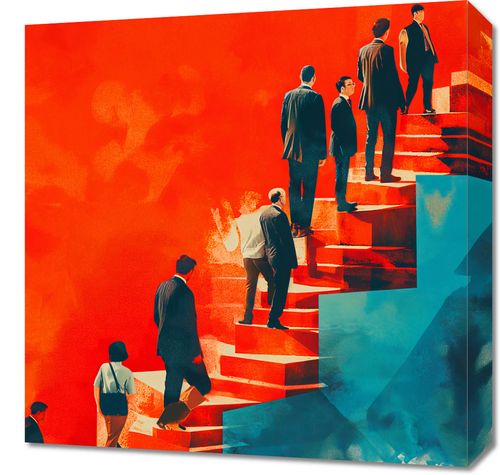 Obraz z serii abstrakcja zatytułowany Metafory Sukcesu. Przedstawia on różne postacie w formalnym ubiorze, wchodzące i schodzące po schodach, które rozdzielają się i zbiegają w różnych kierunkach. Tło obrazu jest podzielone na dwie kontrastujące strony - jedna w odcieniach czerwieni, a druga w chłodnych błękitach, symbolizując różne ścieżki i wybory w życiu zawodowym lub osobistym. Styl graficzny łączy elementy abstrakcyjne i figuralne, a silne kontrasty kolorystyczne podkreślają dynamikę i złożoność podejmowanych decyzji. Obraz ten mógłby być inspirującym dodatkiem do biura lub przestrzeni pracy, zachęcającym do refleksji nad własnym rozwojem i aspiracjami.