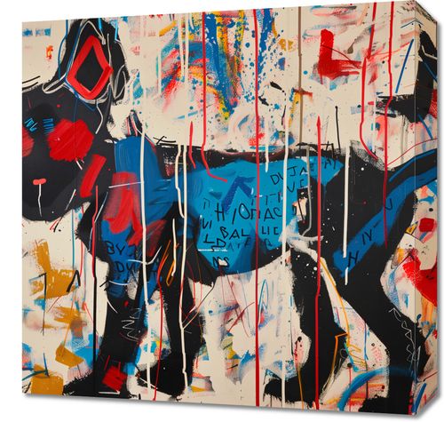 Obraz z serii abstrakcja zatytułowany Miejski Pies. Żywa kompozycja przedstawia sylwetkę psa w stylu street art w której dominują kolory takie jak czerwień, niebieski i żółty, które są rozmieszczone na płótnie w sposób dynamiczny i spontaniczny. Praca wydaje się być pełna ruchu dzięki pociągnięciom pędzlem i kroplom farby rozpryskującym się w różnych kierunkach. Na pierwszy plan wyłania się czarna sylwetka psa, której kontury są podkreślone kontrastującymi barwami i szkicowym stylem. W tle można dostrzec chaotyczne linie i formy, które mogą symbolizować miejski chaos i energię, a także fragmenty tekstu, które dodają dziełu charakteru ulicznego muralu. Całość sprawia wrażenie radosnej i pełnej energii ekspresji artystycznej. Świetnie sprawdzi się w nowoczesnych przestrzeniach miejskich.