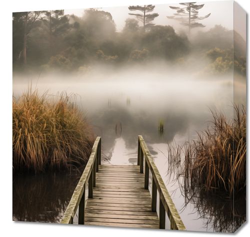 Obraz z serii pejzaże zatytułowany Most do Tajemnicy. Na tym mistycznym obrazie drewniana kładka prowadzi nas ku tajemniczej mgle, która delikatnie spowiła powierzchnię spokojnego stawu. Złote trzciny i zarysy drzew rzucają się w oczy na tle zamglonego poranka, tworząc uczucie ciepła i spokoju. Ten obraz oddaje piękno niewidzialnego świata, który czai się tuż za zasłoną mgły, zachęcając widza do refleksji i odkrywania nieznanego. Idealnie nadaje się do wnętrz, gdzie dominuje natura i spokój, takich jak salony spa, pokoje relaksacyjne, czy prywatne biblioteki. To wyjątkowy element dekoracyjny, który może przynieść element kontemplacji i odprężenia do każdego domu lub przestrzeni publicznej.