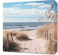 Obraz z serii pejzaże zatytułowany Nadmorski Most to tytuł tej zapierającej dech w piersiach ilustracji, która przemawia do duszy miłośnika morza. Delikatne trawy morskie tańczą w rytmie przybrzeżnego wiatru, a spokojne fale delikatnie docierają do złocistego piasku, tworząc melodię naturalnego spokoju. Nieskazitelnie błękitne niebo przechodzące w pastelowe odcienie na horyzoncie dodaje głębi i przestrzeni, tworząc obraz idealny do umieszczenia w przestrzeniach, które celebrują ciszę i kontemplację. Ten obraz będzie wyjątkowym dodatkiem do każdej plażowej chaty, salonu nadmorskiego domu, a nawet biura, przypominając o nieskończonej przestrzeni i wolności, jaką oferuje morze.