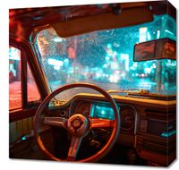 Obraz z serii pop art zatytułowany Nocny Kierowca, przedstawia widok z wnętrza klasycznego samochodu, patrząc przez deszczową, skraplaną szybę na rozświetlone neony miejskiego pejzażu nocą. Ciepłe, czerwone oświetlenie wnętrza samochodu kontrastuje z hipnotyzującym błękitem i elektrycznymi odcieniami świateł zewnętrznych, tworząc intymną, a jednocześnie dynamiczną atmosferę. Kropelki deszczu na szybie dodają tekstury i głębi, sprawiając, że scena jest zarówno realistyczna, jak i liryczna. To dzieło sztuki mogłoby znaleźć swoje miejsce w przestrzeniach nowoczesnych, miejskich loftów lub jako akcent w barze o tematyce retro, wprowadzając element tajemniczości i miejskiego romansu.
