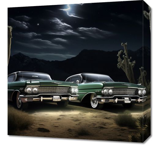 Obraz z serii wnętrza zatytułowany Nostalgiczne Spotkanie ukazuje dwa klasyczne samochody z lat 50., zaparkowane bok w bok pod rozgwieżdżonym nocnym niebem. W tle majestatyczne, ciemne góry rysują się na horyzoncie, a pomiędzy nimi a samochodami rozpościera się dzika pustynna sceneria, z charakterystycznymi kaktusami saguaro. Oświetlone przez delikatne światło księżyca, pojazdy prezentują swoje błyszczące, zadbane karoserie, które odbijają blask gwiazd. Scena ta emanuje spokojem i bezczasowością, przywołując wspomnienia podróży i przygód z minionych epok. Ten obraz doskonale odnajdzie się w przestrzeniach miłośników motoryzacji, retro kawiarniach lub jako elegancki akcent w salonach domowych, inspirując do marzeń o podróży przez historię i amerykański krajobraz.