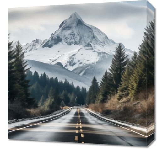 Obraz z serii pejzaże zatytułowany Odważna Podróż, przedstawia majestatyczną górę wyłaniającą się z pośród ciemnozielonych drzew iglastych, które wyznaczają drogę prowadzącą w kierunku jej śnieżnego szczytu. Siła i niezachwiana postawa góry w połączeniu z miękkimi konturami puchowych chmur nad nią tworzą doskonałą równowagę między wytrwałością a delikatnością. Czarna, wilgotna nawierzchnia drogi, rozświetlona światłem odbijającym się od jej wilgotnej powierzchni, prowadzi wzrok obserwatora wprost do serca dzikiej przyrody. Kontrast między ciemnymi drzewami a bielą śniegu dodaje dziełu głębi i tajemniczości. Ten obraz będzie idealnym dodatkiem do wnętrz o tematyce przygodowej i eksploracyjnej, jak również doskonałym wyborem dla przestrzeni biurowych firm turystycznych lub agencji podróżniczych, gdzie może inspirować i przypominać o majestacie i pięknie niezbadanych zakątków świata.