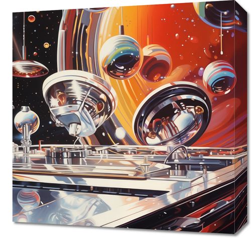 Obraz z serii pop art zatytułowany Orkiestra Sfer. Przedstawia futurystyczną symfonię kosmicznych stacji i satelitów, które unoszą się w przestrzeni wśród majestatycznych planet i wszechogarniających gwiazd. Bogate w detale, błyszczące konstrukcje odbijają się w lustrzanych powierzchniach, tworząc hipnotyzujące wzory świetlne, które przenoszą widza w odległy wymiar. Dynamiczna perspektywa i żywe kolory sprawiają, że obraz jest prawdziwym świadectwem ludzkiej wyobraźni i dążenia do odkrywania nieznanego. To dzieło doskonale nadaje się do nowoczesnych przestrzeni takich jak biura technologicznych firm, centra nauki, a także jako inspirujący element dla domowych biur i pokojów zabaw.