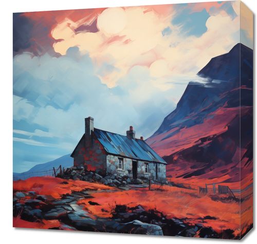 Obraz z serii pejzaże zatytułowany Ostatni Bastion. Obraz przedstawia osamotniony domek umiejscowiony w surowym, ale majestatycznym krajobrazie, pod dramatycznym niebem o intensywnych odcieniach czerwieni i błękitu. Zmierzch słońca rzuca ciepłe światło na dzikie, wrzosowe pola, tworząc kontrast z chłodnymi tonami górskiego tła. Ten obraz wyraża surowe piękno i niezłomność natury, a także ludzką tęsknotę za prostotą i ciszą. Idealnie nadaje się do wnętrz, które pragną wprowadzić poczucie spokoju, odosobnienia i kontemplacji natury.