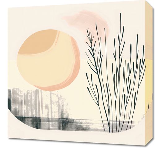 Obraz z serii boho zatytułowany Pastelowy Wschód. Obraz ukazuje subtelny, linearny rysunek roślinności na tle dużego, pastelowego słońca i delikatnie zaznaczonych elementów krajobrazu. Kompozycja w pastelowych, ciepłych barwach tworzy wrażenie spokojnego wschodu słońca, który rozświetla delikatne kontury roślin i miękkie formy w tle. Obraz ten idealnie wpasuje się do wnętrz o stonowanej kolorystyce, gdzie może dodać odrobinę ciepła i subtelnego charakteru. Doskonale nadaje się do sypialni, salonów, czy innych miejsc odpoczynku, gdzie wprowadzi łagodny nastrój i poczucie wyciszenia.