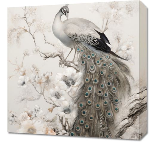 Obraz z serii wnętrza zatytułowany Pawia Gracja. Ta grafika przedstawia majestatycznego pawia spoczywającego na gałęzi, otoczonego przez delikatne kwiaty magnolii. Kunsztownie oddane detale piór i kwiatów w pastelowej palecie barw tworzą uczucie spokoju i harmonii. Obraz ten jest idealny dla miłośników piękna natury i sztuki, doskonale nadaje się do wnętrz o klasycznej i eleganckiej estetyce, takich jak salon, sypialnia, a także jako wyjątkowy element dekoracyjny w spa lub miejscach relaksacji.