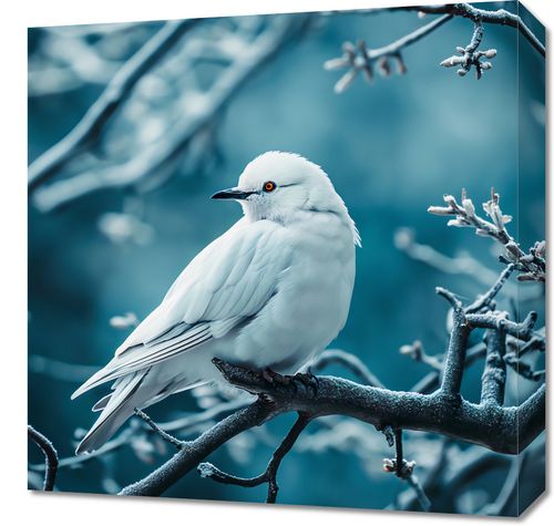 Obraz z serii natura zatytułowany Perłowy Ptak przedstawia urokliwy obraz białego ptaka, który spoczywa na gałęzi drzewa. Ptak, o perłowo białym upierzeniu i przejmujących pomarańczowych oczach, wydaje się być wyizolowany od świata, znajdując ukojenie w zimowej aurze. Tło w chłodnych, niebieskich tonacjach kontrastuje z ciepłym akcentem koloru oczu ptaka, tworząc atmosferę harmonii i spokoju. Delikatne szrony na gałęziach dodają obrazowi delikatności i subtelności, zaś skomponowany w minimalistycznej estetyce, ten plakat jest idealny do wnętrz, które cenią sobie spokój, elegancję oraz kontakt z naturą. Doskonale wpasuje się w przestrzenie takie jak salony relaksacyjne, gabinety terapeutyczne czy nawet jako ukojenie dla oczu w dynamicznie zmieniających się współczesnych biurach.