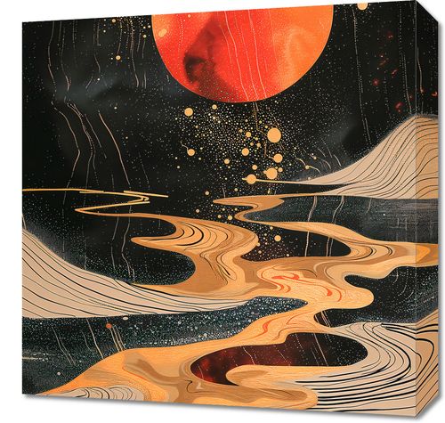 Obraz z serii abstrakcja zatytułowany Planetarny Taniec. Prezentuje on oniryczną scenerię, w której złoto-czerwone rzeki snują się przez kosmiczną przestrzeń, prowadząc do majestatycznego, czerwonego słońca. Wzburzone złote drobinki i linie przypominające galaktyczne falowania dodają głębi i dynamiki, tworząc wrażenie ruchu i niekończącej się podróży przez wszechświat. Ten obraz, z jego abstrakcyjnymi formami i bogatą kolorystyką, może stanowić centrum uwagi w nowoczesnych wnętrzach, inspirując do refleksji nad niezgłębionym pięknem kosmosu. Idealny dla miłośników astronomii, science fiction oraz wszystkich, którzy chcą dodać swoim przestrzeniom odrobinę kosmicznego majestatu.