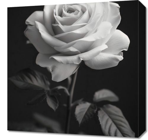 Obraz z serii wnętrza zatytułowany Płatki Róż. Obraz przedstawia ponadczasowy, monochromatyczny obraz róży. Róża, z delikatnymi i szczegółowymi płatkami, jest wyeksponowana na ciemnym tle, co wyostrza jej obrys i podkreśla subtelne niuanse jej formy. Gra światła i cienia nadaje głębi i trójwymiarowości, a ułożenie płatków w pełnym rozkwicie symbolizuje piękno i doskonałość. Liście i łodyga są skromne, ale wyraźne, dodając naturalności całej kompozycji. Obraz oddaje esencję delikatności i elegancji róży, co sprawia, że jest idealny dla każdego, kto szuka elementu dekoracyjnego o subtelnym pięknie i spokojnej, relaksującej estetyce.