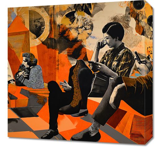 Obraz z serii pop art zatytułowany Przestrzeń Do Dialogu. Prezentuje grupę ludzi w stylizowanych retro ubraniach, zanurzonych w konwersacji i zatopionych w swoich myślach, co sugeruje głębię ludzkiego połączenia i introspekcji. Tło plakatu to geometryczne i abstrakcyjne formy w odcieniach pomarańczu, żółci i brązu, nawiązujące do lat 60. i 70. XX wieku, wprowadzając elementy vintage do nowoczesnej przestrzeni. Postacie wydają się pochłonięte rozmową, a ich pozy i gesty odzwierciedlają osobistą wymianę i komunikację. Obraz ten jest idealny do kawiarni, salonów, bibliotek, lub jako inspirujący akcent w domowych biurach, zachęcając do refleksji i twórczego dialogu.