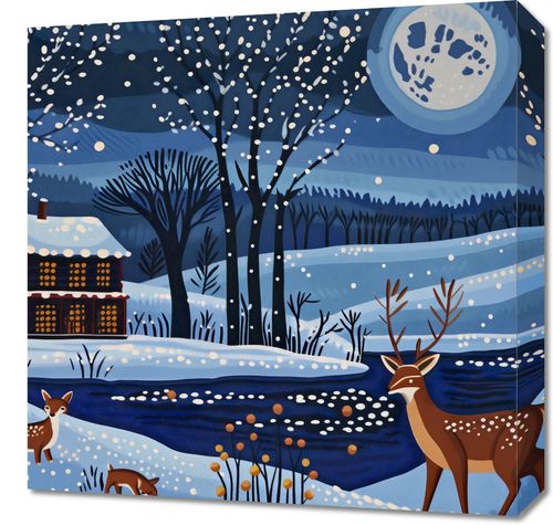Obraz z serii abstrakcja zatytułowany Przyszła Zima. Obraz przedstawia malowniczą, zimową scenę w stylistyce folklorystycznej. Na obrazie dominują chłodne odcienie niebieskiego, tworząc nocny krajobraz pokryty śniegiem. Centralny motyw stanowi dom z oświetlonymi oknami, co nadaje scenie ciepły, przytulny akcent. Śnieg delikatnie opada na drzewa i dach domu, a pełnia księżyca rozświetla niebo, odbijając się w zamarzniętym strumieniu. Na pierwszym planie widać sylwetki zwierząt: dorosłego jelenia i młodego lisa, które dodają kompozycji naturalnego życia i ruchu. Tło przedstawia malownicze wzgórza i lasy, co współgra z idyllicznym, spokojnym nastrojem obrazu. Scena ta wywołuje uczucie spokoju i cichej radości, sprawiając, że plakat ten jest idealny do dekoracji wnętrz w zimowym okresie, dodając im ciepła i uroku.