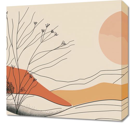 Obraz z serii boho zatytułowany Pustynna Wydma. Obraz ukazuje krajobraz z delikatnie zarysowanymi roślinami na tle łagodnych, pustynnych wydm. Spokojna kolorystyka, opierająca się na miękkich odcieniach beżu, pomarańczy i czerwieni, oddaje kojący klimat zmierzchu. W tle widoczne jest wielkie, ciepłe słońce, które rzuca złoty blask na całą scenę, nadając jej harmonijny charakter. Ten obraz będzie piękną dekoracją do wnętrz, które pragną wprowadzić elementy natury w połączeniu z minimalistycznym designem. Jego uspokajające barwy i proste linie idealnie wpasują się w przestrzenie takie jak sypialnie, salony, miejsca odpoczynku, czy nawet biura kreatywne, pragnące wykreować przestrzeń sprzyjającą relaksowi i inspiracji.
