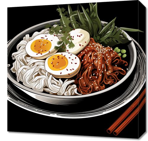 Obraz z serii wnętrza zatytułowany Ramen w Sztuce. Ta apetyczna ilustracja przedstawia klasyczną miskę ramenu, w której harmonijnie komponują się ułożone białe nudle, soczyste półmiski jajka, pikantne kiełki i świeże zielone warzywa, wszystko oprawione w wyraziste akcenty sosu i przypraw. Intensywne kolory i precyzyjne detale rysunku, od czerwonych pałeczek po lśniące składniki, celebrują estetykę i smak tradycyjnego japońskiego dania. Plakat ten wniesie do każdej przestrzeni, od kuchni po jadalnie, ducha nowoczesnego designu i miłości do kulinarnych przyjemności.