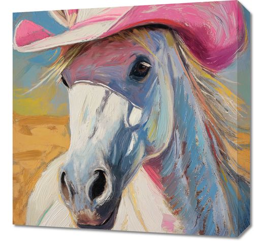 Obraz z serii pop art zatytułowany Różowy Kapelusz to barwna i pełna życia ilustracja przedstawiająca portret konia w różowym kapeluszu kowbojskim. Wyraźne, dynamiczne pociągnięcia pędzla i bogata paleta barw nadają obrazowi wrażenie ruchu i żywiołowości. Tło w ciepłych odcieniach żółci i błękitu podkreśla sylwetkę konia, a różowy kapelusz dodaje humorystyczny, ale i elegancki akcent kompozycji. Obraz ten idealnie nadawałby się do dekoracji wnętrz z charakterem, takich jak westernowe bary, restauracje z amerykańską tematyką, pokoje młodzieżowe czy inne przestrzenie, które chcą wprowadzić element zabawy i niekonwencjonalności.