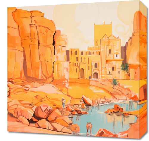 Obraz z serii abstrakcja zatytułowany Ruiny pod Słońcem. Ta ilustracja przedstawia scenę z antycznymi ruinami w ciepłej, pastelowej palecie kolorów, która oddaje odczucie spiekoty i światła słonecznego. Zarysy starożytnej architektury wyrastają z pustynnego krajobrazu, nadając scenerii poczucie wieczności i historii. Odbicie wody i subtelne sylwetki postaci w tle wprowadzają ludzki wymiar do tej scenerii, sugerując trwającą obecność i ciągłość cywilizacji. Obraz ten idealnie wprowadzi do każdego wnętrza element przygody i odkryć, inspirowany podróżami i historią, idealny dla przestrzeni publicznych, biur podróży, a także jako dekoracja w domach miłośników historii.