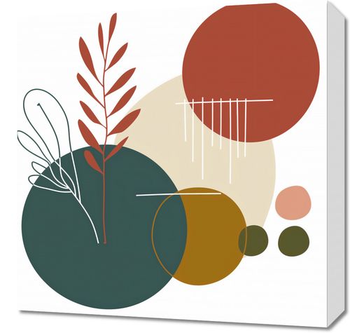 Obraz z serii minimalistyczne zatytułowany Rytm Warkotu. Ta grafika przedstawia stylizowane rośliny w ciepłych odcieniach czerwieni i zieleni, kontrastujące z geometrycznymi kształtami kół w spokojnych barwach beżu, żółci i głębokiej zieleni. Linie pionowe, wydające się być jak deszcz, dodają dynamiki i lekkości kompozycji.Ten obraz będzie się pięknie prezentować w przestrzeniach, które celebrują spokój i naturę. Doskonale wpasuje się w estetykę zen, ekologicznych wnętrz, czy w każdym pomieszczeniu, które ma na celu wprowadzenie elementów natury do domowego otoczenia. Będzie to świetny wybór dla tych, którzy szukają dekoracji ściennych do jasnych, przestronnych pomieszczeń, takich jak salony, jadalnie czy przestrzenie do medytacji.