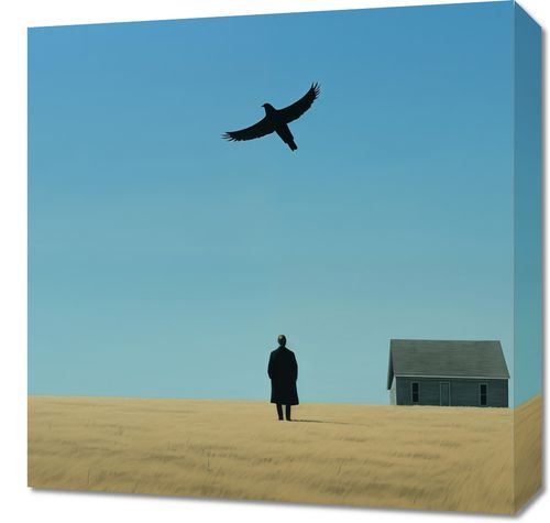 Obraz z serii abstrakcja zatytułowany Samotny i Wolny. Ten spokojny obraz prezentuje postać stojącą na rozległym polu, zwróconą w stronę małego domu i latającego wysoko ptaka. Kompozycja wyróżnia się prostotą i czystością linii, a jej ograniczona paleta barw - złocistych traw, jasnoniebieskiego nieba i ciemnych sylwetek - przyciąga uwagę i wywołuje uczucie spokoju. Obraz symbolizuje kontrast między uczuciem izolacji a pragnieniem wolności, co może być interpretowane na wiele sposobów. Idealny do przestrzeni, które cenią sobie spokój i refleksję, takich jak pokoje do medytacji, minimalistyczne salony, czy współczesne gabinety.