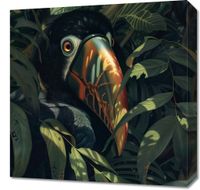 Obraz z serii natura zatytułowany Skryty Tukan przedstawia zaskakujący i intensywny portret tukana, zanurzonego w gęstej, tropikalnej zieleni. Ptak ma swoje charakterystyczne, kolorowe dziob w odcieniach pomarańczy i czerni, który odbija światło, tworząc efekt lustrzanego odbicia. Jego przenikliwe oko, obserwujące widza, dodaje głębi i charakteru kompozycji. Otaczające go rośliny są pełne detali, z subtelnymi gradiencjami kolorów i światłocieni, co tworzy efekt trójwymiarowości i ukrycia. Ta ilustracja emanuje tajemnicą tropikalnego lasu, gdzie natura i dzikie zwierzęta współistnieją w delikatnej równowadze. Obraz ten jest idealny dla przestrzeni, które cenią sobie piękno natury i chcą wprowadzić element dzikiej, nieujarzmionej przyrody do swojego otoczenia.