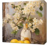 Obraz z serii wnętrza zatytułowany Słodkie Chwile. Delikatne białe kwiaty o subtelnym żółtym środku rozkwitają pełnym blaskiem obok dojrzewających cytryn, które wyróżniają się na tle w delikatnych pastelowych odcieniach. Starannie postarzana butelka i rustykalne drewno dodają nuty nostalgii i spokoju do tej kompozycji. Delikatna gra światła i cienia tworzy głęboką atmosferę i dodaje ciepła do sceny. Świetnie sprawdzi się w kawiarniach o prowansalskim stylu, domowych jadalniach dla tych, którzy pragną dodać do swojej przestrzeni odrobinę wiejskiego uroku, czy też w hotelach, gdzie chce się podkreślić elegancję i ciepło naturalnych elementów.