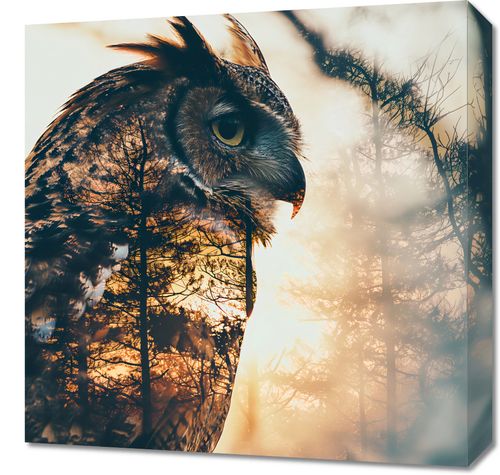 Obraz z serii natura zatytułowany Sowi Duch. Prezentuje on majestatyczną sylwetkę sowy zlewaną z tłem o zachodzie słońca w lesie, co podkreśla jej dziką naturę i instynktowną mądrość. Ciepłe odcienie zachodzącego słońca i sylwetki drzew przenikają się z delikatnym konturem sowy, tworząc wrażenie jedności z naturą. Obraz ten idealnie wpasuje się w przestrzenie takie jak gabinet, biblioteka lub salon, gdzie może inspirować do refleksji i spokoju, przypominając o głębokich, nieodkrytych aspektach natury.