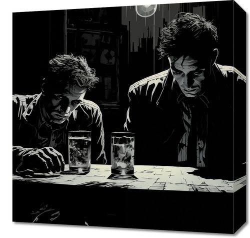 Obraz z serii abstrakcja zatytułowany Spiskowcy. Ta grafika przedstawia dwóch mężczyzn zanurzonych w głębokiej konwersacji przy barowym stole. Stylizacja na czarno-biało uchwyciła napięte, dramatyczne oświetlenie i cienie, które nadają scenie klimat tajemniczości i suspensu. Wyraźne kontury i kontrastowe światłocienie podkreślają wyraziste postaci mężczyzn i ich zacięte postawy. Obraz ten przemawia do miłośników klasycznego kina i literatury, doskonale nadając się do dekoracji przestrzeni o męskim charakterze, takich jak prywatne gabinety, domowe bary czy miejsca spotkań.