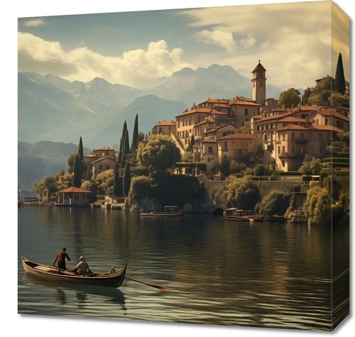 Obraz z serii pejzaże zatytułowany Spokojna Nostalgia, ten urzekający pejzaż przenosi nas do sielankowej wioski nad jeziorem, gdzie czas zdaje się płynąć wolniej. Łagodne światło rozlewające się nad architekturą wioski i gładką powierzchnią wody tworzy poczucie ciepła i spokoju. Para przemieszczająca się łodzią dodaje element ludzki, harmonijnie wpisując się w krajobraz. To dzieło sztuki idealnie nadaje się do przestrzeni, które mają na celu wprowadzenie atmosfery spokoju i refleksji, takich jak biblioteki, poczekalnie lub prywatne gabinety, zapewniając odprężającą ucieczkę od codziennego zgiełku.