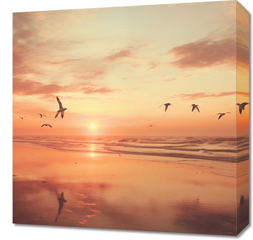 Obraz z serii pejzaże zatytułowany Spokojna Przystań przedstawia idylliczny wschód słońca nad morzem, gdzie złociste promienie światła tańczą po delikatnie falującej powierzchni wody. Sylwetki mew unoszących się na ciepłym powietrzu dodają uczucia wolności i bezkresu. Rozmyte odbicia ptaków na mokrym piasku nadmorskim wzbudzają uczucie spokoju i kontemplacji. Ten obraz jest kwintesencją ukojenia, idealny do wnętrz o tematyce nadmorskiej, czy to w prywatnych rezydencjach pragnących złapać oddech od miejskiego zgiełku, jak i w przestrzeniach wellness, spa, czy hotelowych lobby, gdzie głównym celem jest relaks i odprężenie.
