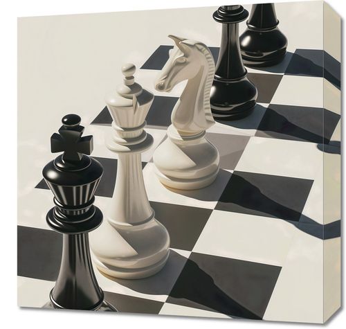 Obraz z serii abstrakcja zatytułowany Szach i Mat. Na obrazie widzimy fotorealistyczną kompozycję szachów w akcji. Białe i czarne figury są elegancko rozmieszczone na szachownicy, co sugeruje intensywność i strategię gry. Cienie rzucone przez figury na błyszczącą powierzchnię szachownicy nadają głębi i trójwymiarowości obrazu. Skupienie na kilku głównych figurach, takich jak wieża, hetman i skoczek, może symbolizować krytyczny punkt w grze, gdzie każdy ruch ma kluczowe znaczenie. Tło jest jasne i neutralne, co pozwala skupić się na dynamice gry bez rozpraszających elementów. Obraz ten mógłby być idealnym dodatkiem do przestrzeni dla miłośników szachów lub jako dekoracyjny element w przestrzeni wspólnej, bibliotece lub pokoju gier, dodając elegancji i intelektualnego charakteru.