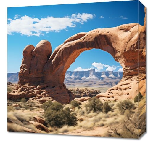 Obraz z serii pejzaże zatytułowany Triumf Natury. Zapierający dech w piersiach widok naturalnej formacji skalnej, która tworzy naturalny łuk, jest świadectwem niezwykłej siły i wytrwałości natury. Ciepłe odcienie pomarańczu i brązu skalnego łuku kontrastują z głębokim błękitem nieba, a delikatne zielone akcenty roślinności dodają życia i głębi kompozycji. Ta scena emanuje siłą i spokojem, stanowiąc doskonałe uzupełnienie dla przestrzeni takich jak współczesne biura, eleganckie pokoje dziennego wypoczynku, a także jako element dekoracyjny w hotelach i miejscach publicznych, gdzie natura spotyka się z designem.