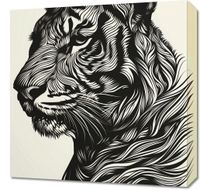Obraz z serii wnętrza zatytułowany Tygrysi Gwizd. Ta dramatyczna grafika przedstawia tygrysa w stylu linorytu, z wyraźnymi, płynnymi liniami układającymi się w złożony wzór futra. Monochromatyczna paleta, z ciemnymi i jasnymi odcieniami na neutralnym tle, podkreśla majestatyczną postawę i intensywny wzrok tego dzikiego zwierzęcia. Obraz emanuje siłą i elegancją, oddając w pełni królewski charakter tygrysa. Idealny do wnętrz urządzonych w stylu minimalistycznym lub nowoczesnym, będzie także pasował do przestrzeni, które chcą podkreślić motywy przyrodnicze lub eksplorować tematykę ochrony dzikiej przyrody.