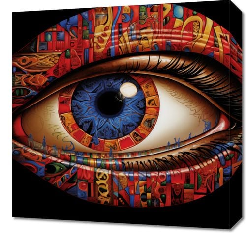 Obraz z serii abstrakcja zatytułowany W Oku Obserwatora. Ta złożona, surrealistyczna grafika przedstawia ludzkie oko, w którego tęczówce odzwierciedlone są bogate, abstrakcyjne i symboliczne wzory, przypominające fragmenty różnych dzieł sztuki. Barwne motywy w tęczówce mieszają się z intensywną czerwienią, żółcią i niebieskością, tworząc efekt kalejdoskopu kulturowych wpływów. Zadziwiająca szczegółowość pracy sugeruje głębię ludzkiego spojrzenia i różnorodność perspektyw, które możemy doświadczać poprzez sztukę. Obraz ten z pewnością zaintryguje i stanie się punktem centralnym każdej przestrzeni, szczególnie tam, gdzie sztuka i kreatywność są w cenie, jak studia artystyczne, galerie, czy nowoczesne salony.