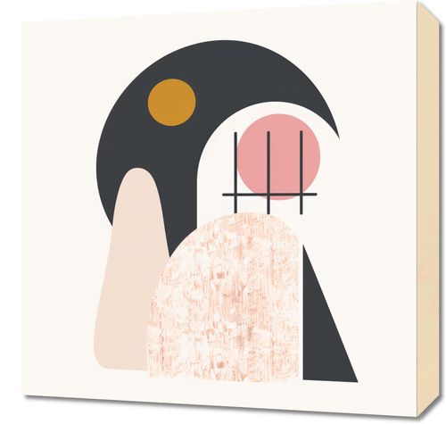 Obraz z serii boho zatytułowany Zakres Widoku.Obraz przedstawia abstrakcyjną kompozycję łączącą kształty zakrzywione i geometryczne, wykorzystującą miękką i spójną paletę kolorów. Dominujące kolory to czarny, odcienie różu, beż oraz akcent żółtego, tworząc poczucie równowagi i nowoczesnej estetyki. Kompozycja składa się z nakładających się form, w tym dużej czarnej figury z wycięciem koła, przez które prześwituje część różowego koła, oraz żółtego koła umieszczonego w obszarze czarnym, co może sugerować ciało niebieskie typu księżyc lub słońce. Obecne są również elementy fakturalne, dodające głębi i intrygi jednemu z kształtów, a proste linie przecinają różowe koło, przyczyniając się do wizualnego zainteresowania dziełem. Całość kompozycji przekazuje spokojne i współczesne wrażenie, prawdopodobnie czerpiąc inspirację z natury i sztuki abstrakcyjnej.