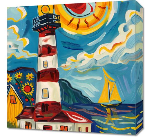 Obraz z serii abstrakcja zatytułowany Żywa Przystań to wesoła i barwna ilustracja przedstawiająca latarnię morską w nadmorskim pejzażu. Wyraziste, kręte linie i żywe kolory nadają scenie energii i ruchu, a dynamiczne słońce z żaglówką na tle morskich fal tworzy optymistyczny obraz. Latarnia morska, z jej klasycznymi czerwono-białymi pasami, stoi dumnie obok uroczego żółtego domku, a całość jest otoczona przez stylizowane kwiaty i roślinność. Styl przypomina ekspresjonistyczne dzieła z początku XX wieku, pełne życia i radości. Ten obraz jest idealny do rozjaśnienia każdego pomieszczenia, nadając mu ciepła i pozytywnej energii, świetnie sprawdzi się w przestrzeniach takich jak salony, pokoje dziecięce czy miejsca publiczne, gdzie może wprowadzić atmosferę spokoju i radosnego spędzania czasu.