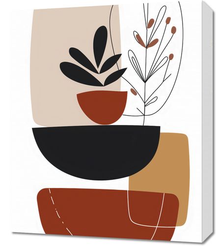 Obraz z serii minimalistyczne zatytułowany Botaniczna Abstrakcja. To artystyczne dzieło przedstawia stylizowane, botaniczne motywy ukryte wśród geometrycznych form. Delikatne rośliny w doniczkach uchwycone są w prostych, ale wyrafinowanych konturach, zaznaczających ich sylwetki na tle złożonego z ciepłych i neutralnych barw tła. Brązy i beże splatają się tu z głęboką czerwienią, tworząc organiczne poczucie natury uproszczonej do esencji formy. Ten obraz doskonale odnajdzie się w przestronnych, jasnych wnętrzach, gdzie natura spotyka się z minimalizmem - idealny do salonów w stylu skandynawskim, spokojnych gabinetów, lub jako ukojenie w dynamicznym, miejskim biurze.