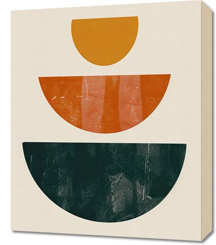 Obraz z serii boho zatytułowany Cykl Natury. Obraz przedstawia trzy przecinające się półkola, ułożone w pionowym szeregu, z których każde posiada unikalną fakturę i paletę barw - od spokojnego, złotego odcienia u góry, przez głęboką pomarańcz z akcentami ciepłej czerwieni pośrodku, do ciemnej, tajemniczej zieleni u dołu. Ta kompozycja wywołuje wrażenie harmonijnego przepływu czasu lub cykli natury. Świetnie sprawdzi się jako dekoracja w nowoczesnych przestrzeniach, takich jak minimalistyczne biura, salony w stylu skandynawskim, a także jako wyrafinowany akcent w strefach wypoczynkowych kawiarni lub butikowych hoteli.