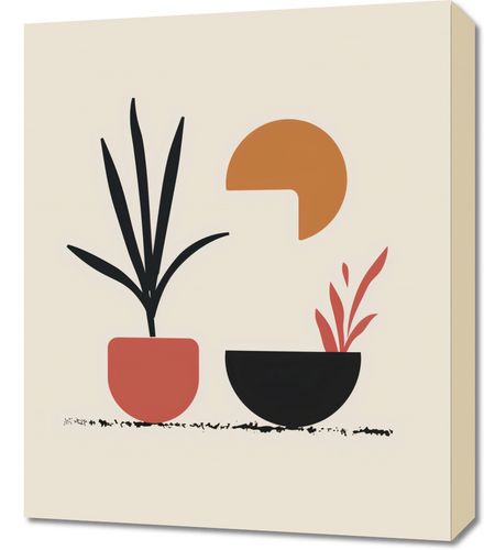 Obraz z serii boho zatytułowany Domowy Ogród. Obraz łączy proste, geometryczne formy roślin z ciepłą kolorystyką, tworząc przytulny obraz domowego ogrodu. Czerwony i czarny wazon z roślinnością wyrastają nad delikatną linia ziemi, przywołując obrazy spokojnego wnętrza. Niedokończony półksiężyc w kolorze pomarańczowym dodaje kompozycji delikatności i podkreśla domową atmosferę. Dzieło doskonale nadaje się do miejsca, które ma być oazą spokoju i relaksu, takiego jak sypialnia lub cichy kącik do czytania. Jego proste i spokojne kolory mogą również przynieść harmonię do miejsca pracy lub studiowania, promując skupienie i spokój.