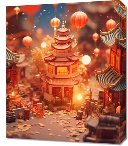 Obraz z serii motywy wschodnie zatytułowany Festiwale Świata. Ta urocza i ciepła kompozycja przedstawia tradycyjny azjatycki dom w sercu starożytnego miasta, rozświetlonego przez setki lampionów unoszących się w powietrzu, co nadaje scenie atmosferę świętowania i radości. Subtelne światło i złote konfetti na pierwszym planie tworzą efekt głębi i magicznego blasku. Obraz ten wprowadza do wnętrza ducha azjatyckiej kultury i jest doskonałym dodatkiem do przestrzeni, które chcą uczcić piękno i tradycję festiwali latarni, takich jak restauracje, salony spa lub jako wyjątkowy akcent w domowych salonach.
