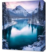 Obraz z serii pejzaże zatytułowany Górzyste Prześwity. Ten obraz ukazuje zachwycający zimowy krajobraz z krystalicznie czystym jeziorem, które odbija lśniące szczyty górskie i pastelowe barwy zachodzącego słońca. Obfite śnieżne pokrywy na drzewach i brzegach jeziora dodają scenie poczucia spokoju i izolacji. Idealny do wnętrz, które chcą wprowadzić elementy spokojnego piękna natury, ten plakat jest doskonałym dodatkiem do przestrzeni mieszkalnych, biurowych lub jako ukojenie w miejscach publicznych, wprowadzając atmosferę wyciszenia i odprężenia.