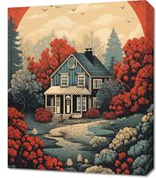 Obraz z serii wnętrza zatytułowany Idylla Rustykalna. Ten ciepły i urokliwy obraz przedstawia sielski dom otoczony przez bujny krajobraz w odcieniach czerwieni i pomarańczy, których intensywność podkreśla zachodzące słońce w tle. Kompozycja łączy w sobie elementy klasycznego amerykańskiego krajobrazu z nostalgicznym uczuciem, które przywodzi na myśl długie, leniwe popołudnia na wsi. Ilustracja ta idealnie nadaje się do nadania charakteru i ciepła każdemu wnętrzu, doskonale pasując do przestrzeni mieszkalnych, kawiarni lub pensjonatów, które chcą zaakcentować swoje powiązania z naturą i wiejskim spokojem.
