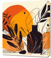 Obraz z serii minimalistyczne zatytułowany Jaskrawy Zachód. Na grafice widnieje silnie stylizowany motyw roślinny, gdzie czarne sylwetki roślin kontrastują z jaskrawo pomarańczowym i żółtym tłem, przypominającym zachodzące słońce. W tle pojawiają się delikatne, abstrakcyjne linie i kształty, dodające kompozycji głębi i tekstury.Ten plakat doskonale wpasuje się w wnętrza ożywione roślinnością, zarówno te domowe, jak i komercyjne przestrzenie typu kawiarnie lub sklepy z roślinami. Jego ciepłe barwy będą wprowadzać przytulną atmosferę i mogą stanowić żywy akcent w przestrzeniach utrzymanych w naturalnej kolorystyce.