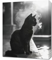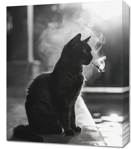 Obraz z serii wnętrza zatytułowany Kocia Przerwa. Na tym obrazie uwieczniono czarnego kota siedzącego na krawędzi, zanurzonego w promieniach rozproszonego światła, które podkreślają jego błyszczącą sierść i wyraziste kontury. Kocie wąsy delikatnie zarysowane w kontraście ze światłem nadają mu wyrazistości, a unoszący się dym tworzy aurę tajemniczości. Jest to obraz zarówno elegancki, jak i zagadkowy, idealny dla miłośników zwierząt i minimalistycznego designu. Obraz ten będzie pasował do każdego wnętrza, od klasycznego po nowoczesne, dodając subtelnego charakteru i spokoju.