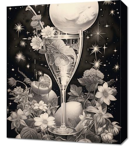 Obraz z serii wnętrza zatytułowany Kosmiczny Eliksir. Niesamowita kompozycja przedstawiająca kieliszek, z którego wylewa się galaktyczny nektar, otoczony kwiatami i roślinami w monochromatycznych barwach. Centralnym punktem jest lśniąca pełnia księżyca, której blask odbija się w szkle, tworząc atmosferę tajemnicy i magii. Gwiazdy migoczą w tle, nadając całości głębokiego, nieskończonego wymiaru. Delikatne linie i szczegóły graficzne wzbogacają kompozycję, czyniąc ją idealnym wyborem do nowoczesnych salonów, galerii sztuki oraz miejsc o tematyce astronomicznej.