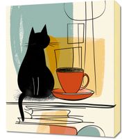 Obraz z serii abstrakcja zatytułowany Kot i Kawa. Ten pełen uroku obraz przedstawia sylwetkę czarnego kota, który wydaje się kontemplować filiżankę kawy. Stylizacja grafiki, z jej czystymi liniami i blokami kolorów w ciepłych odcieniach beżu, ochry oraz stonowanej zieleni i błękitu, tworzy atmosferę spokojnego poranka. Abstrakcyjne elementy w tle, przypominające sztukę modernistyczną, nadają plakatowi współczesnego charakteru. To dzieło sztuki idealnie pasuje do kawiarni, kuchni, a także jako subtelny akcent w nowoczesnym salonie, oferując wizualne wyrażenie komfortu i relaksu.