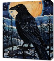 Obraz z serii abstrakcja zatytułowany Kruczy Mąciciel. Ta praca przedstawia majestatycznego kruka, który góruje nad zimowym lasem pod rozgwieżdżonym niebem. Tło, na którym widnieje wielka, pełna księżycowa aureola w złocistych i ciepłych odcieniach, kontrastuje z chłodnymi tonami niebieskiego i czerni, użytych do oddania tajemniczego krajobrazu i ptaka. Kruka cechuje szczegółowe przedstawienie piór, które dodaje tekstury i głębi, a jego silna postać emanuje spokojem i siłą. Obraz ten idealnie pasuje do przestrzeni, które celebrują naturę i jej mityczne aspekty, jak domowe biblioteki, salony w stylu eklektycznym lub pokoje z elementami boho, dodając im charakteru i wyjątkowości.