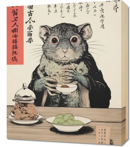 Obraz z serii motywy wschodnie zatytułowany Kulinarne Rozważania. Intrygujące spojrzenie wiewiórki, podkreślane przez wyraziste czerwone oczy i szczegółową sierść, skontrastowane z tradycyjnymi chińskimi znakami, dodającego atmosfery tajemniczości i refleksji. Na stole widzimy starannie podane potrawy, które w połączeniu z urokliwym zachowaniem postaci, tworzą obraz pełen kulturowego bogactwa. Doskonale sprawdzi się w azjatyckich restauracjach serwujących tradycyjne potrawy oraz w galeriach sztuki inspirowanej kulturą wschodu.