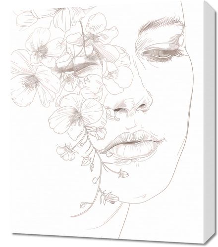 Obraz z serii wnętrza zatytułowany Kwitnąca Imersja przedstawia delikatny, linijny rysunek profilu kobiety, którego twarz częściowo zasłaniają i uzupełniają subtelne kwiaty. Delikatne linie twarzy kobiecej harmonizują z organicznymi kształtami roślin, sugerując jedność z naturą i subtelne piękno. Kwiaty wydają się być naturalnym przedłużeniem jej bytu, dodającym delikatności i eterycznego charakteru całej kompozycji. Ta minimalistyczna, ale wyrafinowana ilustracja emanuje spokojem i ukojeniem, idealna do przestrzeni medytacyjnych, salonów spa, lub jako elegancki element dekoracyjny w nowoczesnych wnętrzach.